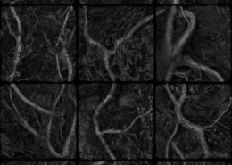 Puis, bien sûr, que serait une telle exposition sans quelques sculptures ?….Elles sont au nombre de quatre, disposées le plus souvent au centre d’un espace. Uno ou Terra Terrae, oeuvre pratiquement éponyme du titre de l’exposition, répond à sa manière à l’idée d’ouverture annoncée par Chiodo fisso. Cette sculpture, blanche et noire, en fibre d’agave, polystyrol, résine et ciment nait de la terre, prend forme, se réveille dans sa forme circulaire et protectrice ,elle devra par la suite se déployer au monde dans un univers encore inconnu. Les trois autres sculptures sont des figures ou plutôt des visages placés sur un socle pour deux d’entre elles, Base per altezza et Camera picta et, la dernière, Senza titolo, est simplement posée à terre dans un tissage visuel de lignes tracées sur les murs et le sol, le but étant toujours de nous faire changer de point de vue.
