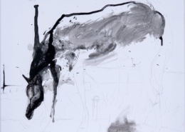 En franchissant l’entrée nous sommes immédiatement confrontés à Chiodo fisso, une oeuvre dessinée au fusain sur le mur et le sol, cette oeuvre donne tout le tempo de l’exposition et le dessein de l’artiste : nous prouver que nous sommes libres de voir, penser et choisir. Chiodo fisso une figure ou plutôt une forme, une image intérieure se répandant dans l’espace, dans le monde, une forme libre, développée sans toile, sans cadre vient nous rejoindre…seuls les fils métalliques, partant du coeur de la forme et accrochés aux murs de part et d’autre, marquent les différents point de vue possibles et donc nous obligent à concevoir l’image dans ses multiples facettes. Cette oeuvre résume la pluridisciplinarité de l’artiste, elle est à la fois sculpture, dessin, mise en scène.