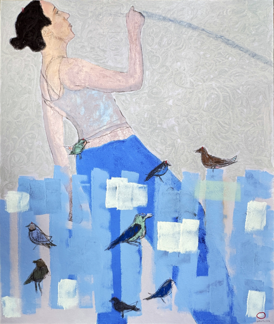 L’artiste, en retrait, nous invite à vivre subrepticement ces temps secrets, intimes, intérieurs et défendus, habités uniquement d’instants pris sur le vif. Moments uniques, suspendus, délicats, personnage diaphanes, le plus souvent tournés vers un espace inaccessible et pourtant désirable, espace évocation d’une autre temporalité, lointaine, douce et accueillante.